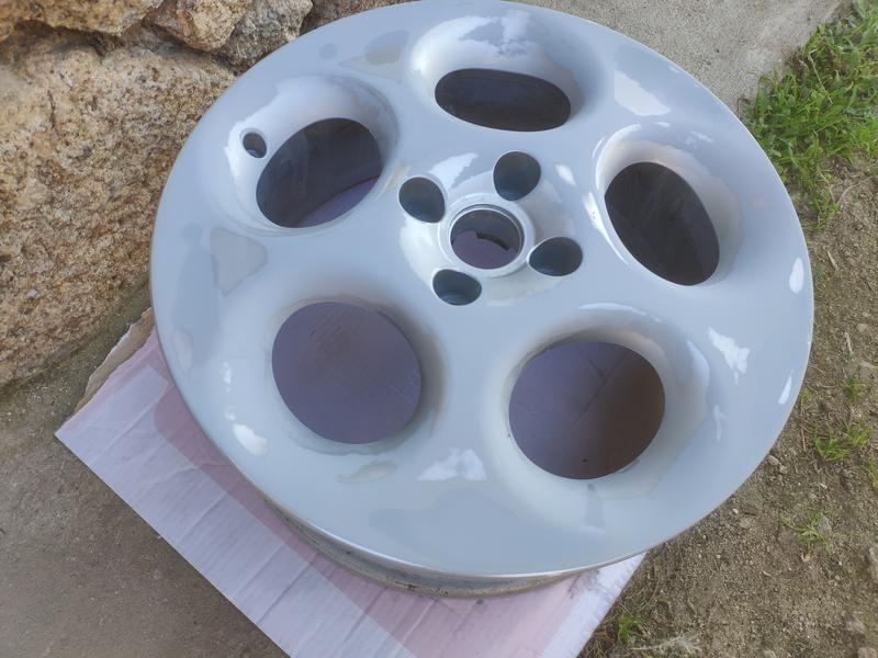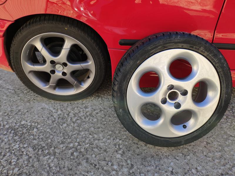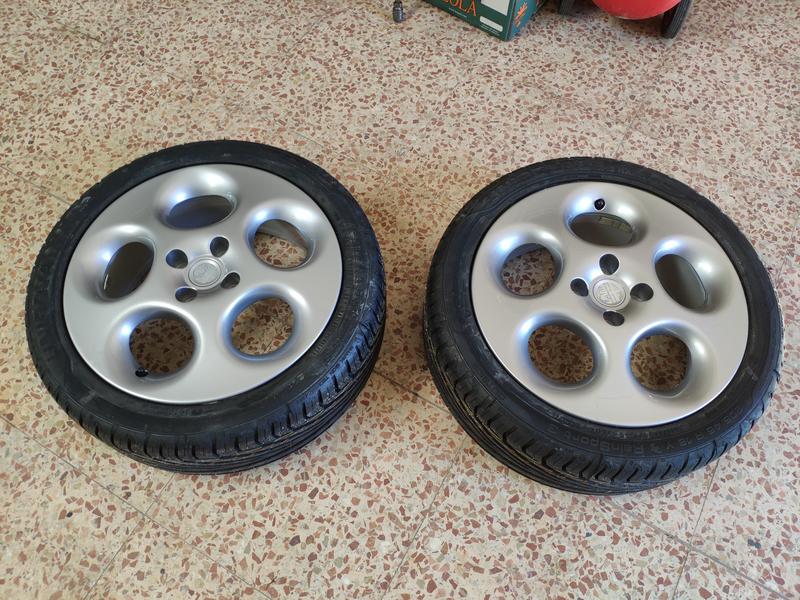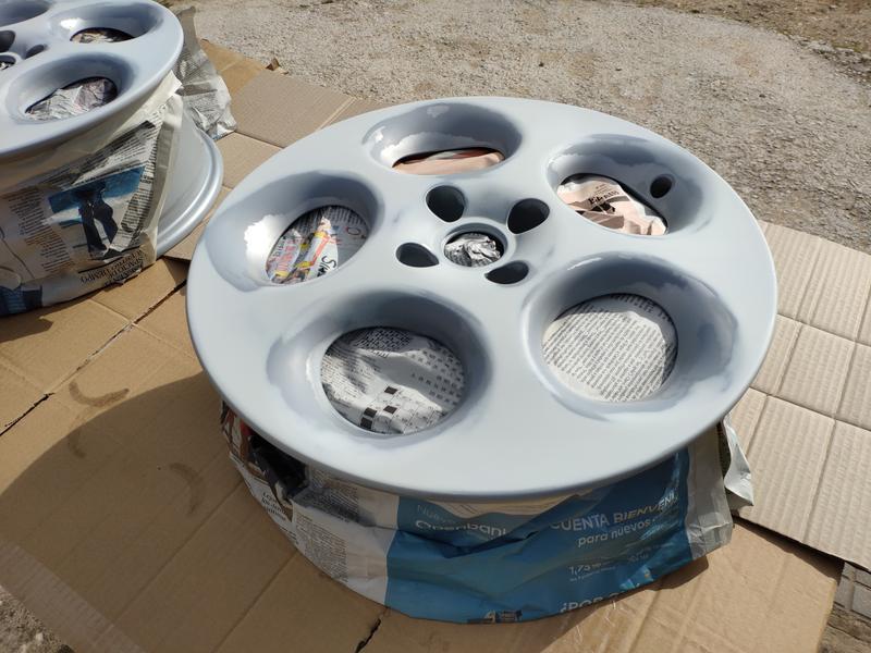 Las dejé unos días que se secasen y ya las pude calzar, le puse Uniroyal RainSport3 en 205/45/16. Y comparadas con el color que le dí a las del Fiat